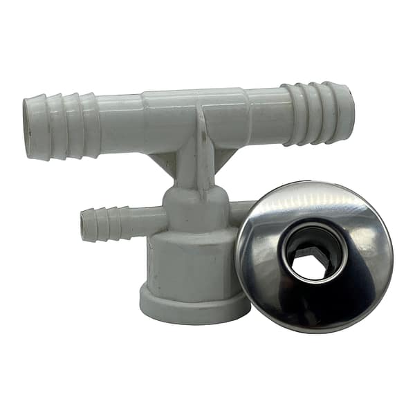 Flow thru body with 19mm Water Barb and 9mm Air Barb.